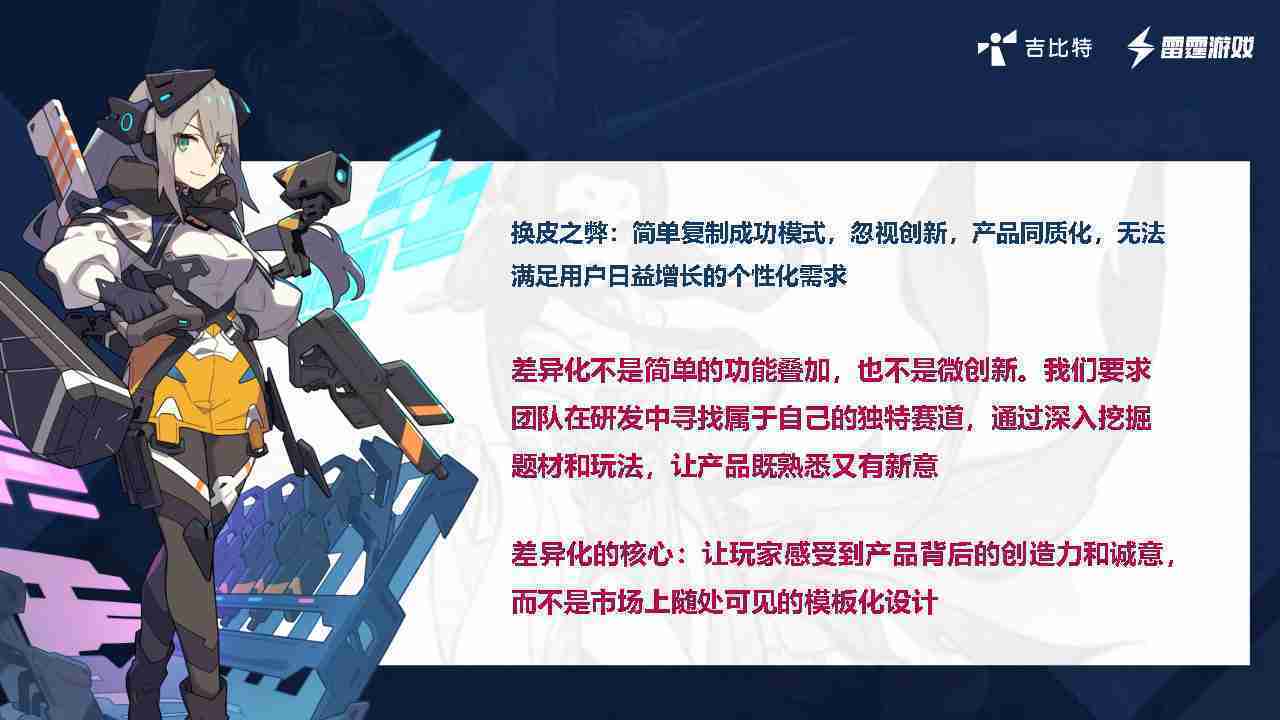 在我们内部是这么定义差异化的。。首先,,,,差异化不是简单的功能叠加,,,,更不是换皮。。。只是换皮,,产品无法提供有效的市场价值。。。内部经常说差异化的产品不是为了迎合市场,,,而是找到一个自己独特的表达方式,,,在研发中找到属于自己的细分赛道和独特赛道,,,,前提是需要对这个题材有足够的深入、、挖掘,,,,对玩法有足够深入的理解,,,让产品看起来既熟悉又有新意。。