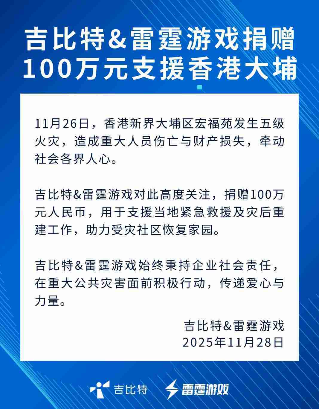 赏金大对决&雷霆游戏捐赠100万元 支援香港大埔火灾救援及灾后重建