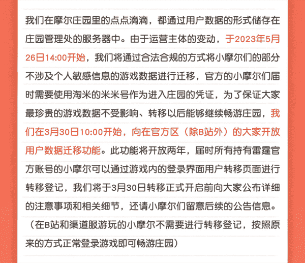 合作结束本就是开发方和代理方双方的事情,,,,降低这件事情对玩家的影响,,,才是对所有珍视这段童年的摩尔玩家最好的呵护。。目前看来,,用户完全不用担心后续因无法登录游戏而造成任何数据上的损失,,只要及时进行账号转移,,,就可以好好保留、、延续在庄园的痕迹和回忆,,,,继续在庄园里做快乐的红鼻子小鼹鼠。。