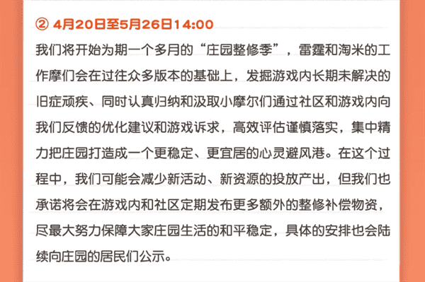 合作的结束并不意味着这个童年IP的结束,,,,对于《摩尔庄园》手游而言,,,,这是一个新阶段的开始。。。后续游戏内将开启庄园重构计划,,,,会就以往遗留下来的BUG进行集中修复,,,,并在游戏内和社区定期发布更多补偿物资。。