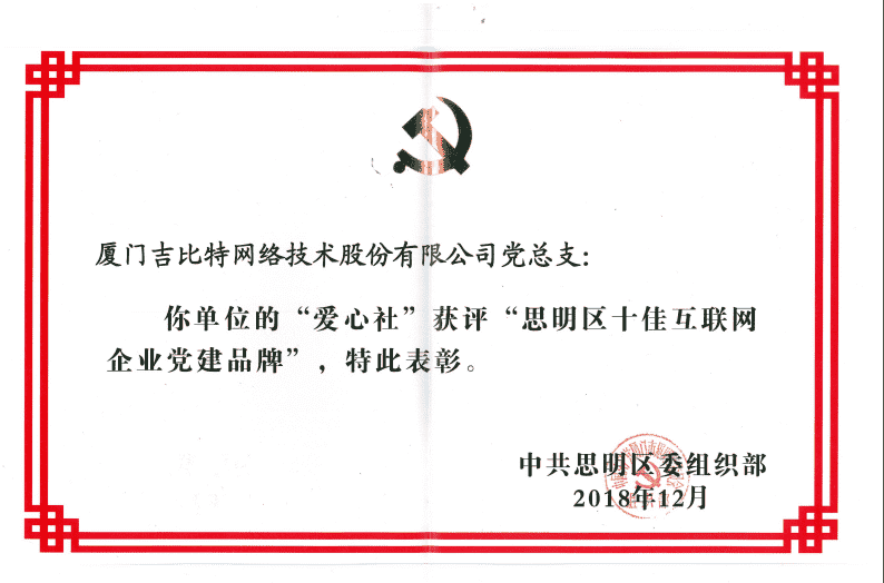 经初审评选、、、、网络评选和专家评审等环节,,,"厦门赏金大对决网络技术股份有限公司党总支-爱心社" 从全区28个参评党建品牌中脱颖而出,,,获评"思明区十佳互联网企业党建品牌"。。。